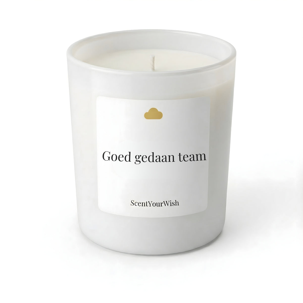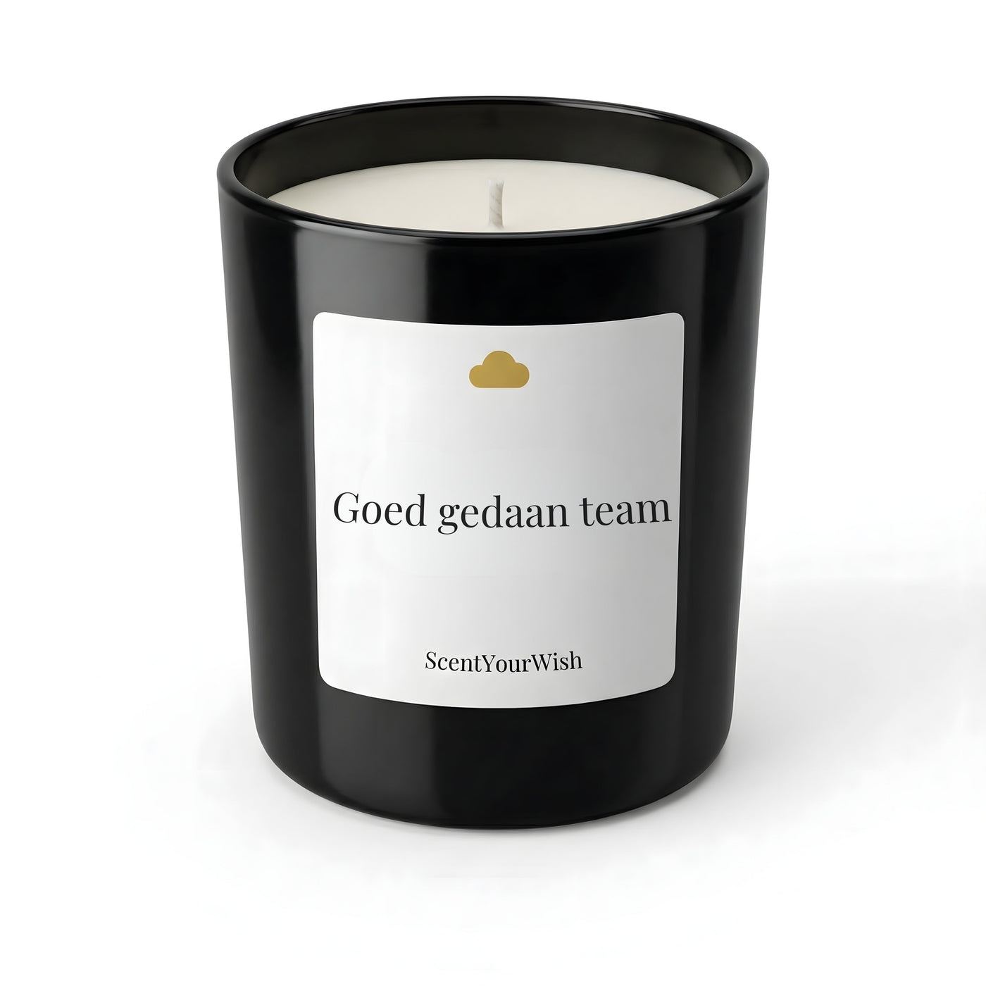 Geurkaars met tekst ""Goed gedaan team"". Warme boodschap om sfeer en gezelligheid te brengen.