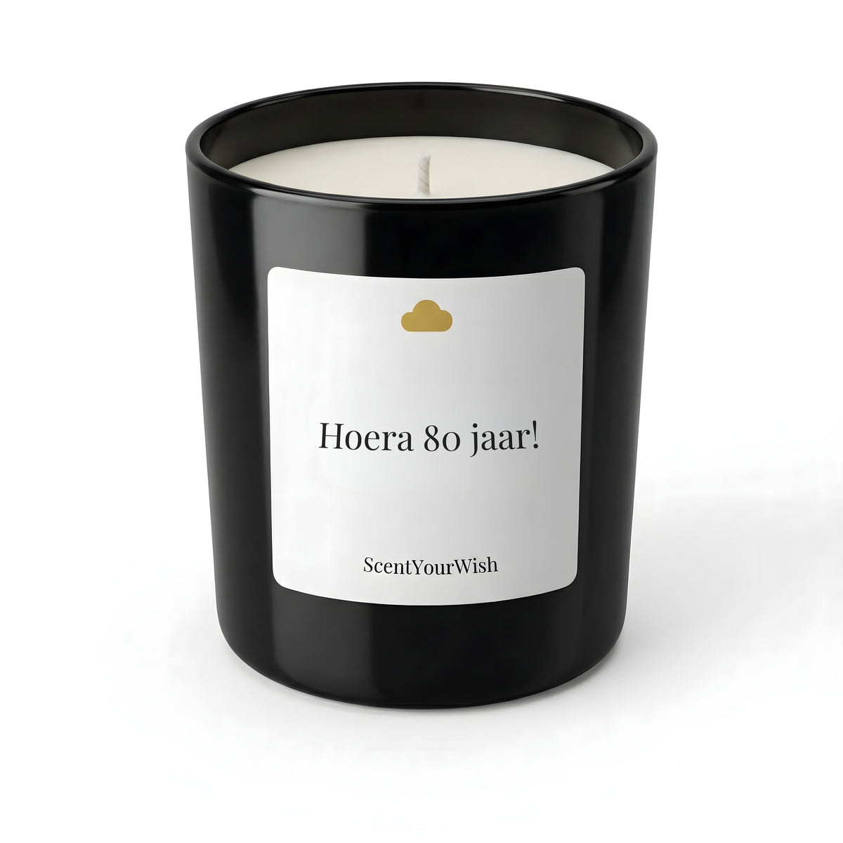 Geurkaars met tekst ""Hoera 80 jaar!"". Warme boodschap om sfeer en gezelligheid te brengen.