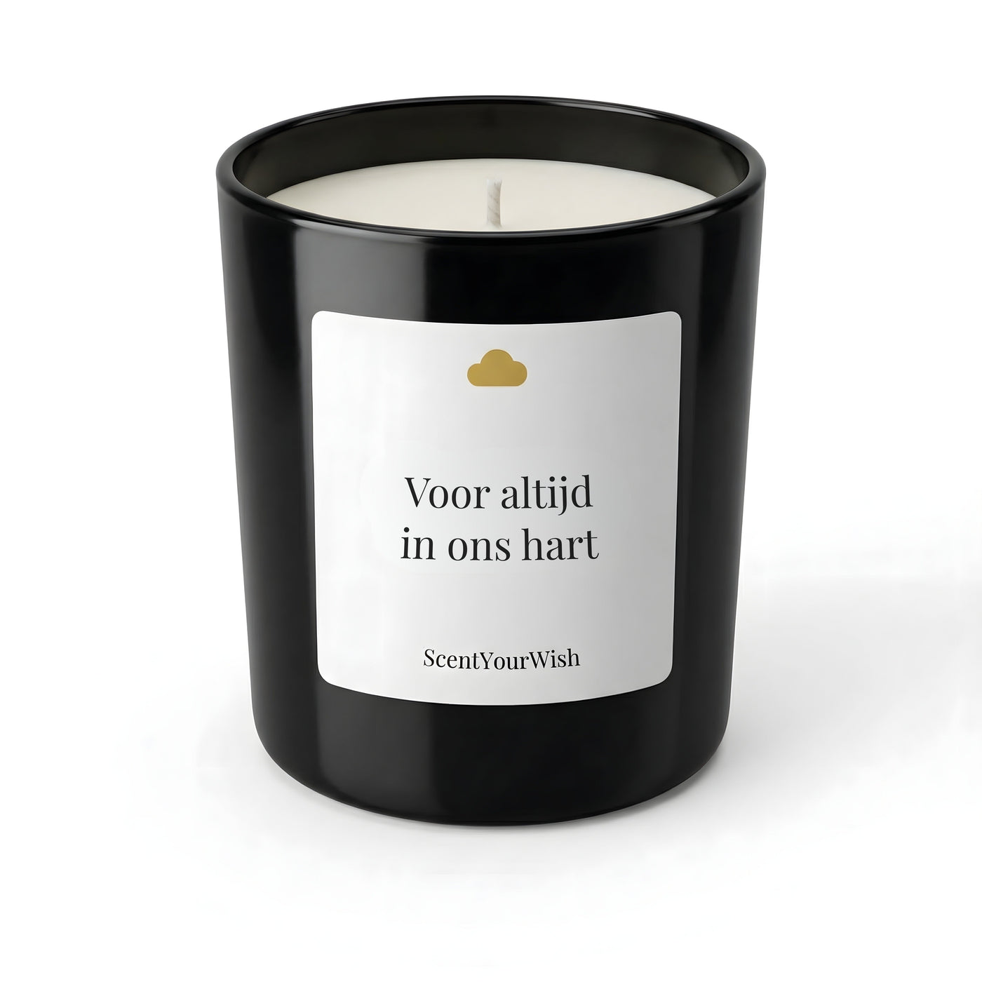 Geurkaars met tekst ""Voor altijd in ons hart"". Warme boodschap om sfeer en gezelligheid te brengen.