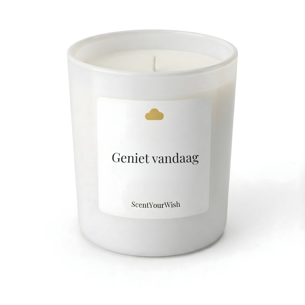 Geurkaars met tekst ""Geniet vandaag"". Warme boodschap om sfeer en gezelligheid te brengen.