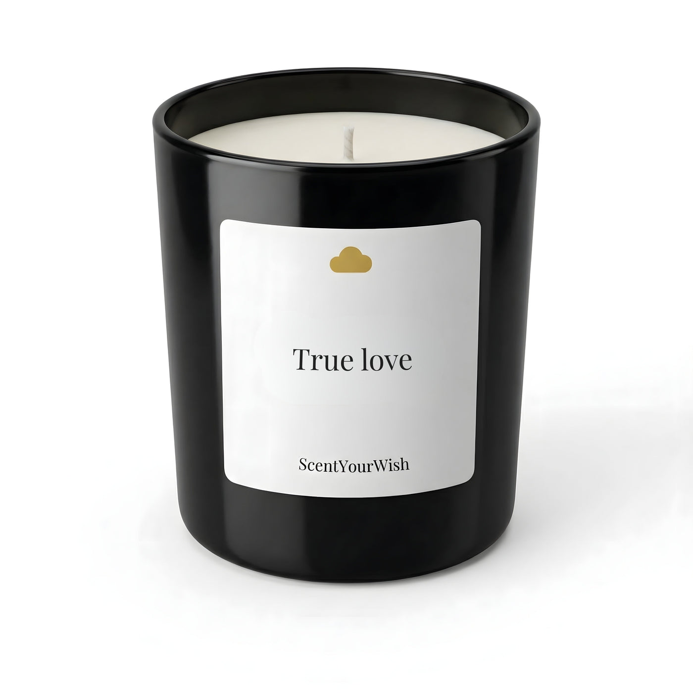 Geurkaars met tekst ""True love"". Warme boodschap om sfeer en gezelligheid te brengen.