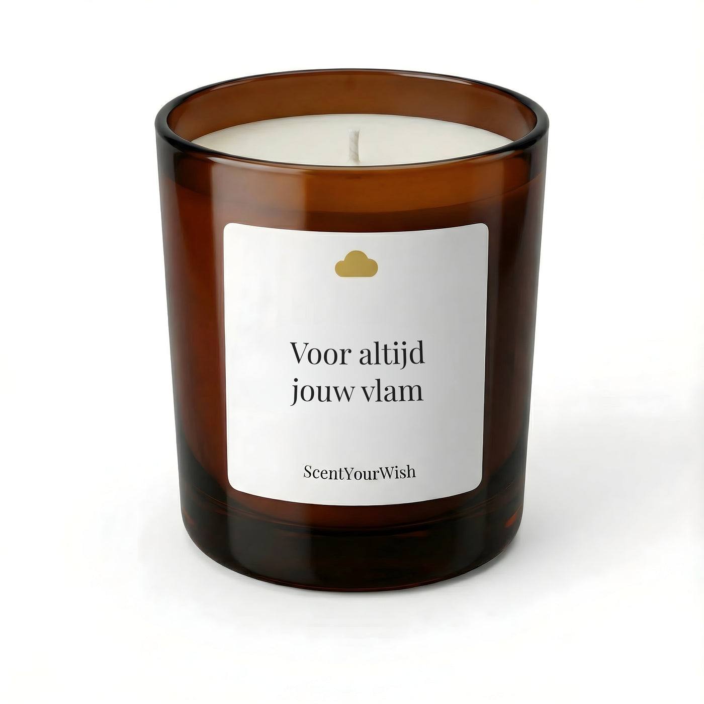 Geurkaars met tekst ""Voor altijd jouw vlam"". Warme boodschap om sfeer en gezelligheid te brengen.